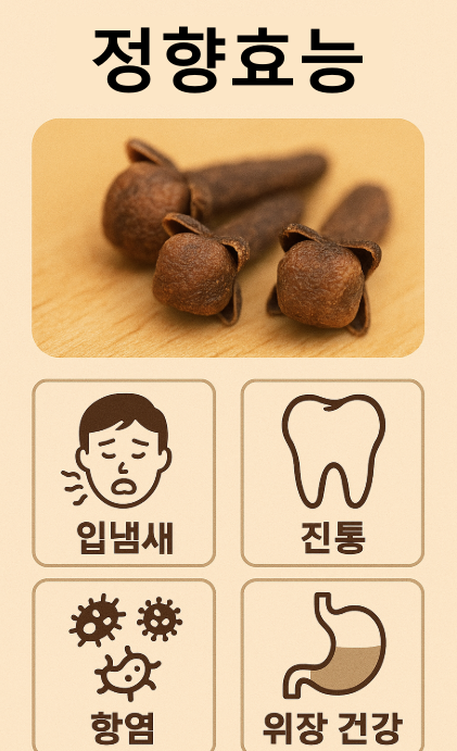 정향은 단순한 향신료를 넘어서 입 냄새 제거, 염증 완화, 통증 억제, 소화 개선까지 다양한 건강 효과를 가진 식물입니다.