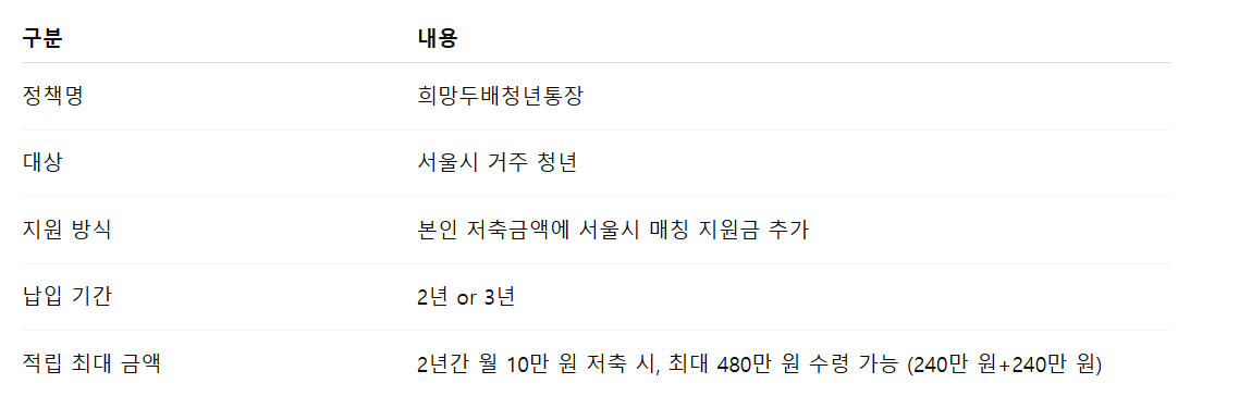 희망두배청년통장은 서울시가 청년의 자산 형성을 돕기 위해 마련한 지원 사업입니다.