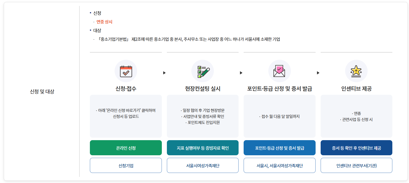 또한, 서울시 포인트제 참여기업은 추후 다른 서울시 지원사업(예: 청년채용 보조금, 중소기업 대출 등) 신청 시에도 가점 혜택을 받을 수 있습니다.